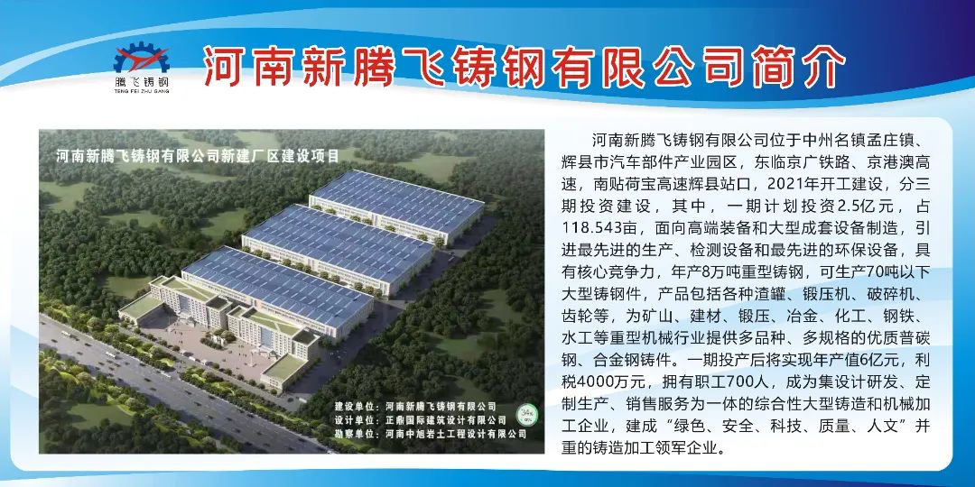 因鑄件產(chǎn)品供不應(yīng)求,為了更好服務(wù)客戶,公司投資2.5億元資金,新建“河南新騰飛鑄鋼有限公司”,占地面積120畝,打造年產(chǎn)8萬噸高 端裝備制造大型優(yōu) 質(zhì)鑄鋼件生產(chǎn)基地。