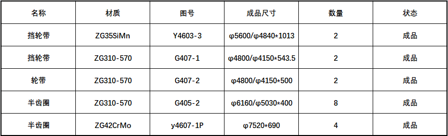 騰飛鑄鋼現(xiàn)有直徑4.6*110m回轉(zhuǎn)窯和直徑4*40m干燥窯配套的擋輪帶,成品4件